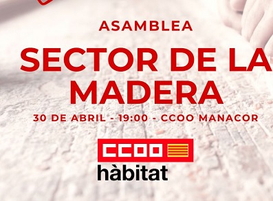 CCOO del Hábitat de Illes Balears convoca Asamblea del sector de la Madera. Ante el bloqueo del convenio, este próximo 30 de abril se debatirá las medidas a llevar a cabo, incluso una posible huelga. CCOO del Hábitat de Illes Balears convoca Asamblea del sector de la Madera.